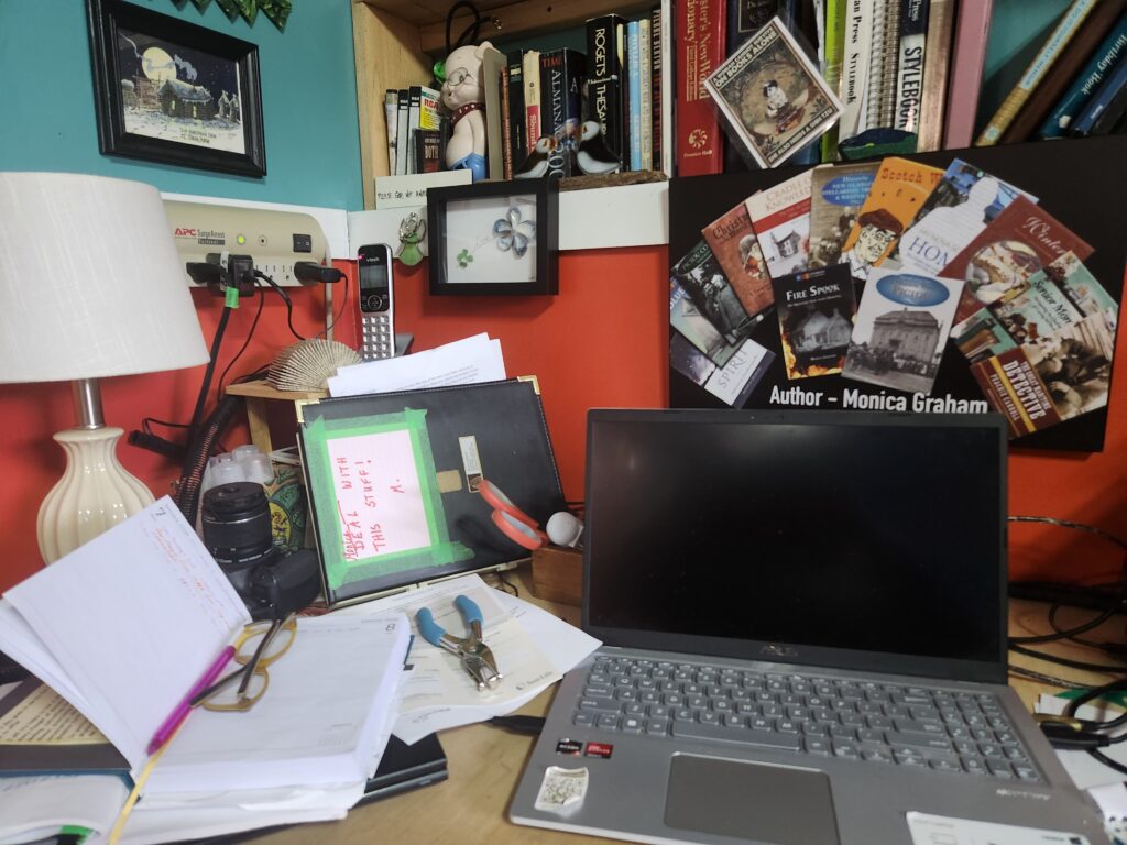I was beavering away happily on an historical novel that spanned three generations across the length and breadth of Canada. I saved it on a thumb drive because I didn’t want to lose the manuscript, and periodically saved it to the cloud and to my computer’s interior workings. I printed out various bits and pieces so I could refer back and forth from the screen to the page, and to help with editing. I survived a “no” from a publisher and hard advice from an agent, and kept writing. With joy.